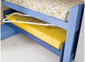 The three elements have different heights, in this way each piece can be easily accessible. The loft bed is placed on the higher rail, the one in the middle is dedicated to the desk, while the lower one is for the pull-out bed movement.