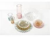 Un’articolata linea di piatti, vassoi, bicchieri, ciotole e caraffe realizzata in un brillante PMMA colorato e trasparente. La particolarità della linea è data dal fatto che ogni modello presenta un pattern diverso di chiara ispirazione naturalistica e organicistica, che si rifà agli stampi che esistevano una volta nelle cucine per fare le gelatine, ed evidenzia la temporalità, e quindi anche la varietà, che contraddistingue ogni passaggio dalla prima all’ultima portata. I colori trasparenti tenui, delicati e facilmente accostabili consentono di apparecchiare tavole variegate: creativa e originale oppure più classica e monocolore. Le sovrapposizioni dei piatti e gli accostamenti dei colori creano un insieme estroso ma discreto, creativo e sofisticato allo stesso tempo